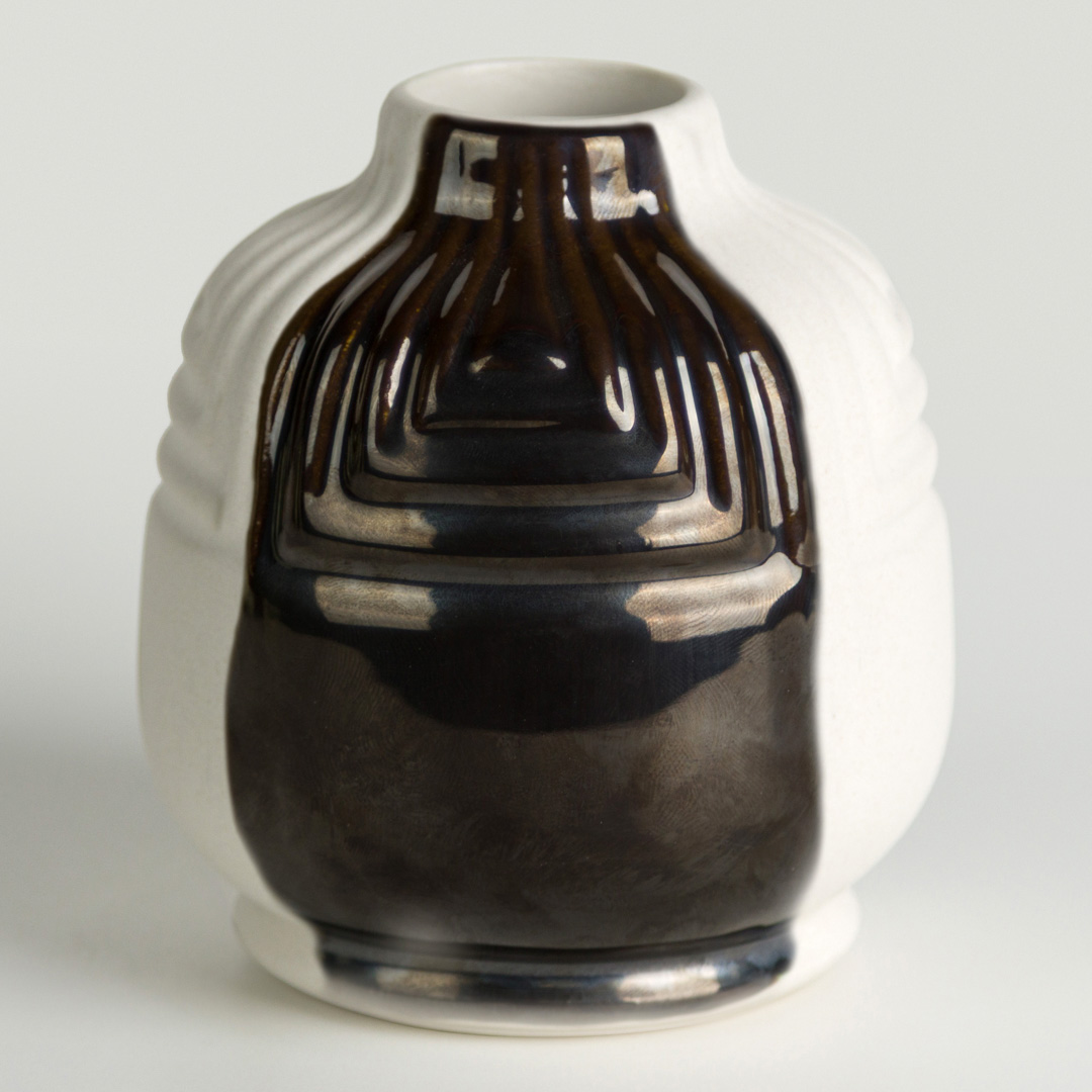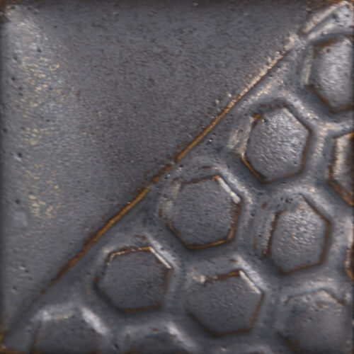 A bassa temperatura (cono 06), questo smalto si presenta come un grigio scuro metallizzato opaco, come l’acciaio brunito (foto 1), che in cottura tende a rompersi in tonalità più scure della stessa gamma cromatica, creando superfici profonde e dinamiche.