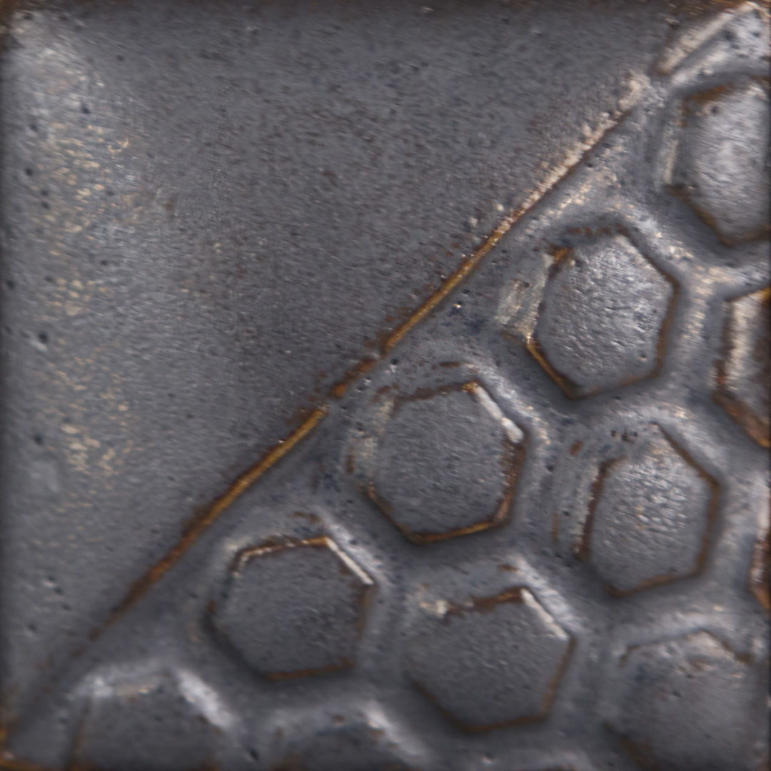Sebbene inizialmente sviluppati per la bassa temperatura, molti colori Elements offrono ottime prestazioni anche a temperature più elevate (cono 6-10). In questo caso il colore cambia sensibilmente, trasformandosi in nero metallico (foto 2, 3 e 4), che si rompe sulla trama e si accumula in un grigio metallico opaco. In questa cottura lo smalto risulta più fluido e mobile.