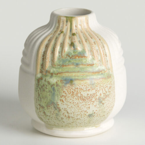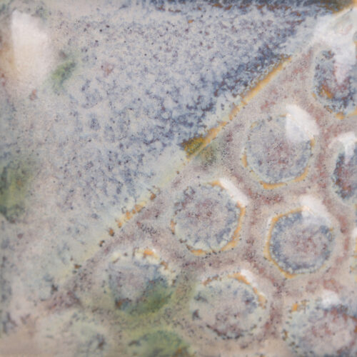 Sebbene originariamente sviluppati per la bassa temperatura, molti colori Elements™ offrono performance interessanti anche a temperature più elevate (cono 6–10). In cotture più alte la base può trasformarsi in un variegato con toni arancio, bianco e verde, mentre le cristallizzazioni blu restano e si fondono. Lo smalto mostra maggiore mobilità, il che può portare a accumuli più intensi nelle aree concave e a frange cromatiche evidenti sui rilievi, dando luogo a risultati visivi dinamici e stratificati (foto 2, 3 e 4).