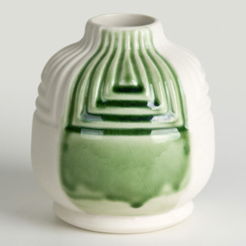 Sebbene originariamente sviluppati per la bassa temperatura, molti colori Elements™ offrono performance interessanti anche a temperature più elevate (cono 6–10). In queste condizioni il colore cambia in un verde trasparente con una maggiore mobilità dello smalto che può generare accumuli più scuri nelle aree concave e rotture cromatiche evidenti sui rilievi, arrivando talvolta a sviluppare delicate sfumature calde simili al marrone rosato (foto 2, 3 e 4). La superficie acquisisce così una dinamica visiva più ricca e profonda, valorizzando texture e dettagli strutturati.