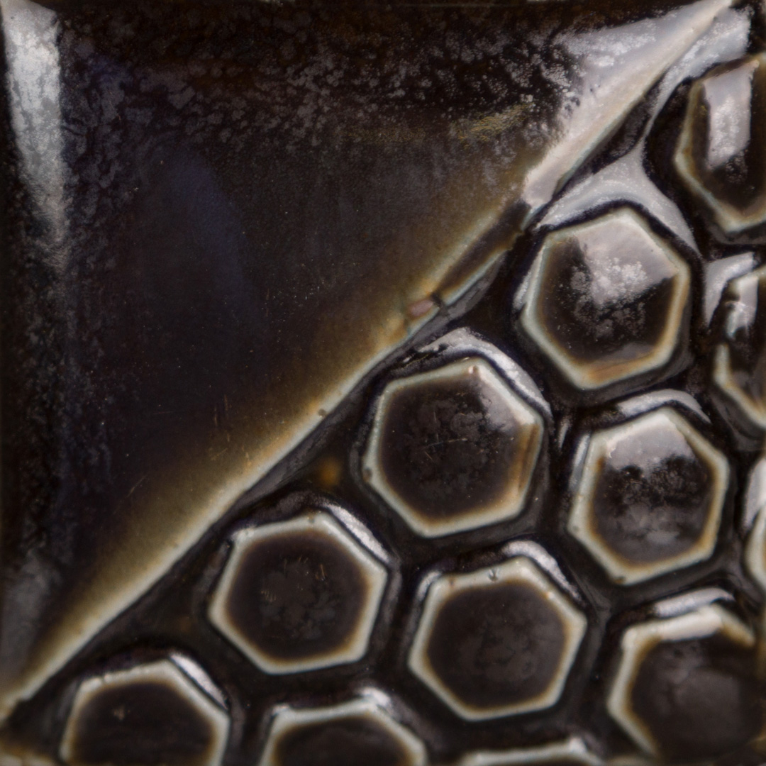 Sebbene inizialmente sviluppati per la bassa temperatura, molti colori Elements™ offrono ottime prestazioni anche a temperature più elevate (cono 6–10). In questo caso il colore evolve verso una tonalità variegata di marrone e blu semi-traslucidi, con accumuli blu nelle aree concave e rotture di colore che si accentuano sulla texture (foto 2 e 3). Lo smalto diventa più fluido e mobile, valorizzando incisioni e superfici strutturate.