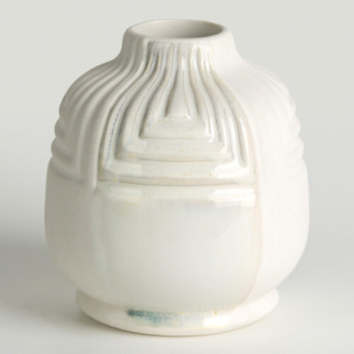 Sebbene originariamente sviluppati per la bassa temperatura, molti colori Elements™ offrono performance interessanti anche a temperature più elevate (cono 6–10). In queste condizioni il colore tende a modificarsi progressivamente: può schiarirsi verso tonalità più pallide, con fenomeni di rottura sulla texture e aree che virano al bianco, con cristallizzazioni gialle in alcune zone, arrivando talvolta a sviluppare delicate sfumature simili al celeste (foto 2, 3 e 4). La mobilità dello smalto è accentuata in alto fuoco, quindi può sviluppare accumuli più marcati nelle aree concave e un aspetto più fluido complessivamente.
