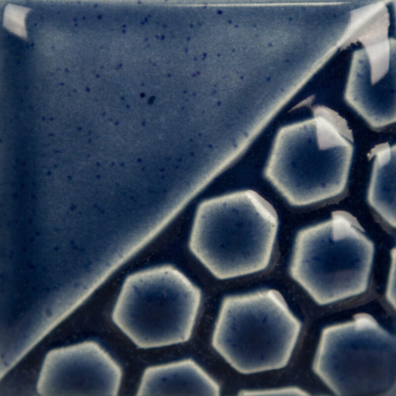 A bassa temperatura (cono 06), Denim Blue si presenta come un blu-grigio lucido con un aspetto che ricorda il tessuto denim, caratterizzato da sottili puntinature blu più scure che conferiscono un effetto spezzato e ricco di texture visiva, con finitura semi-trasparente quando applicato in 2–3 mani (foto 1).