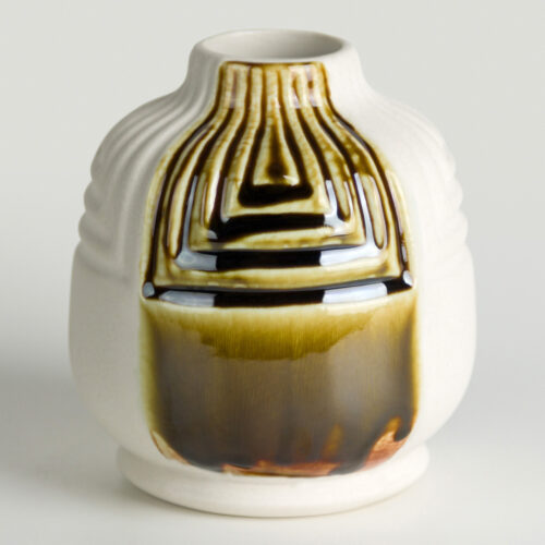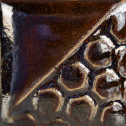 A bassa temperatura (cono 06), lo smalto si presenta come un marrone terroso lucido con delicate sfumature verde‑giallo, semitrasparente dopo 2-3 strati, creando superfici armoniose con variazioni tonali morbide e naturali (foto 1).