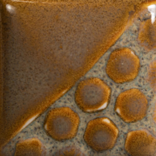 A bassa temperatura (cono 06), questo smalto si presenta come un marrone chiaro lucido e variegato, con una macchia arancio scuro, donando superfici calde con sfumature naturali e ricche (foto 1).