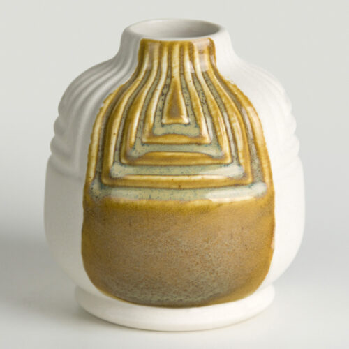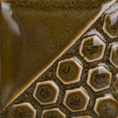 Anche se la serie Elements™ è ottimizzata per basse temperature, molti colori mantengono prestazioni interessanti anche a temperature elevate (cono 6‑10): in queste condizioni la tonalità evolve verso un oro‑marrone semi‑trasparente che si rompe sulle texture, con possibili accumuli più chiari nelle cavità e variabilità nella finitura (foto 2, 3 e 4).