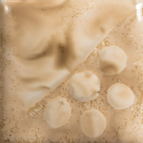A bassa temperatura (cono 06), questo smalto si presenta come un beige crema opaco punteggiato di marrone chiaro e macchie più scure, con cristalli medi di colore nero e bianco che aggiungono un effetto punteggiato unico, simile alla superficie variegata di un frutto di noce maculato (foto 1).