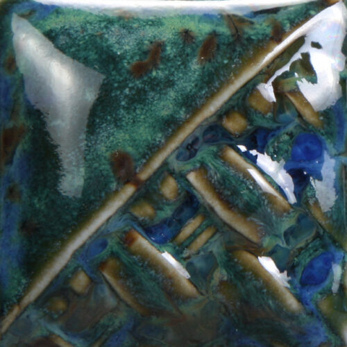 Al cono 6 questo smalto risulterà blu-verde con cristalli neri che rompendosi formano sinuose strisce nere. Salendo di temperatura il colore si scurisce i cristalli si fondono e si integrano nella glassa di base, scurendo il colore e aumentando il movimento.