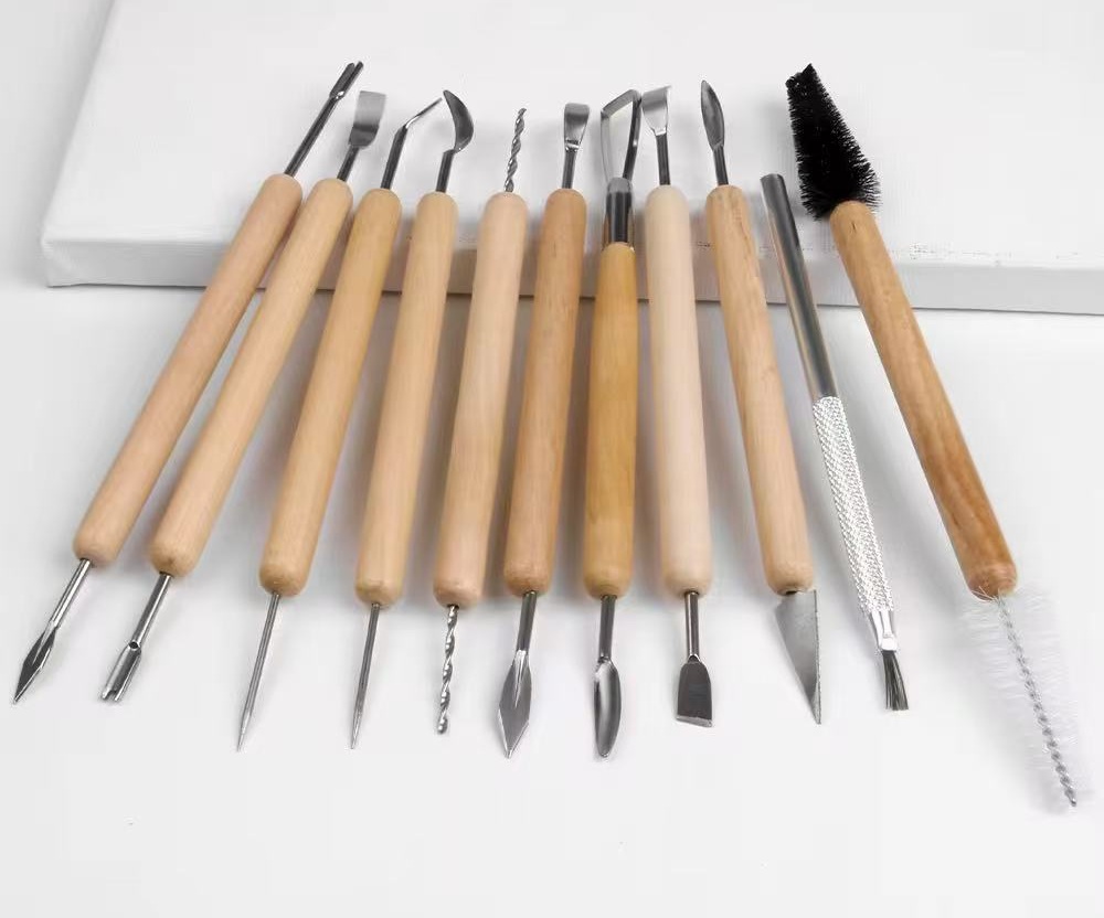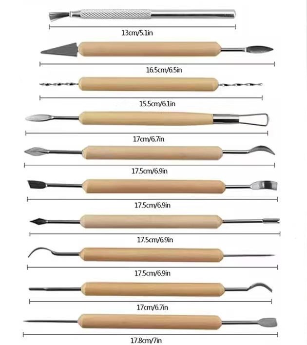 Il kit include 11 strumenti differenti, ciascuno pensato per un tipo di incisione specifico: aghi sottili per linee finissime, spatole inclinate per tratti larghi, punte doppie per pattern regolari, strumenti curvi per scavi di precisione e lame per rimuovere strati superficiali di ingobbio o smalto. Questa varietà permette di realizzare graffiature complesse, decori continui, motivi geometrici e dettagli miniaturizzati.