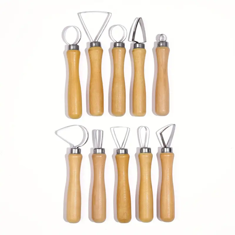 Set professionale di strumenti per l’intaglio di argilla. Composto da 10 utensili con manico in legno e sagome in metallo di dimensioni e forme diverse. Ideale per modellare, scolpire, scavare e rifinire ogni tipo di creazione artistica.