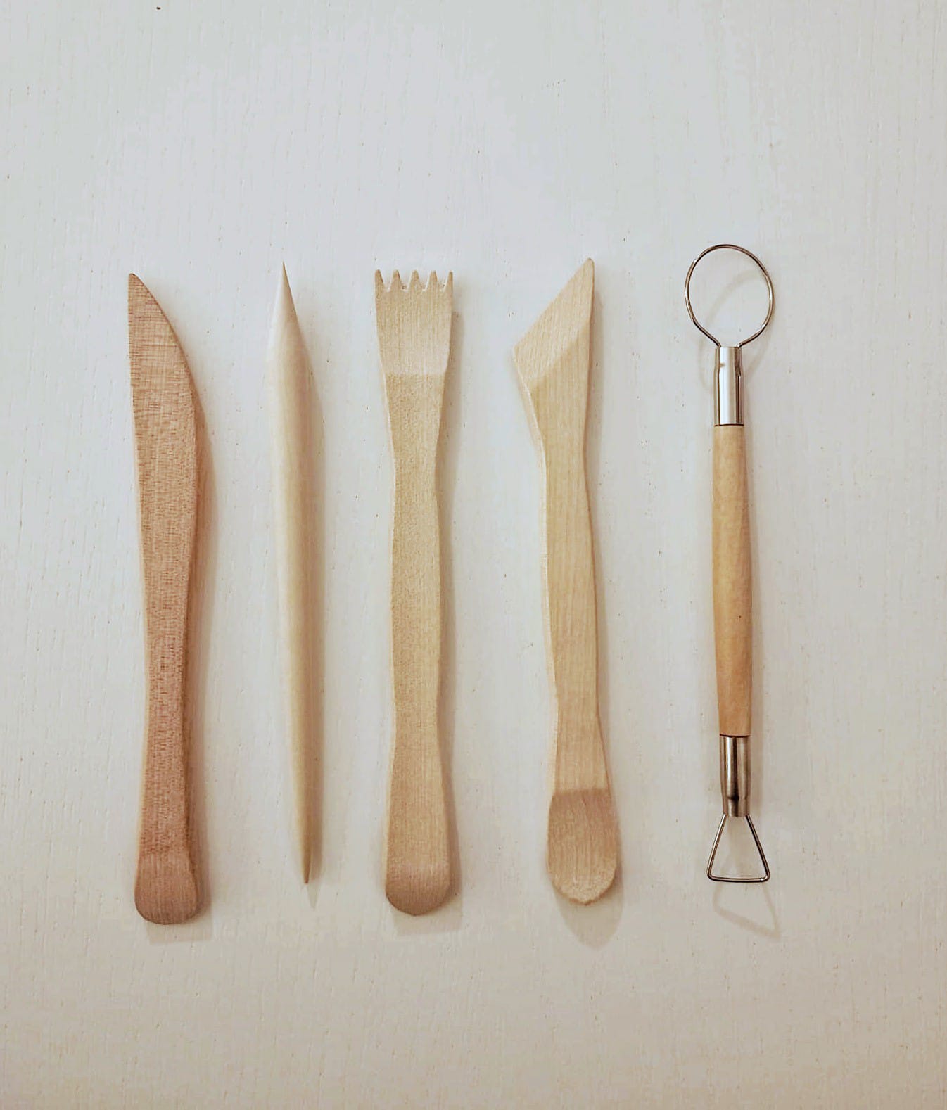 Set di 5 utensili in legno: 3 stecche curve, un punteruolo doppio e una miretta a filo circolare per tagliare, modellare e rifinire argilla con precisione professionale.
